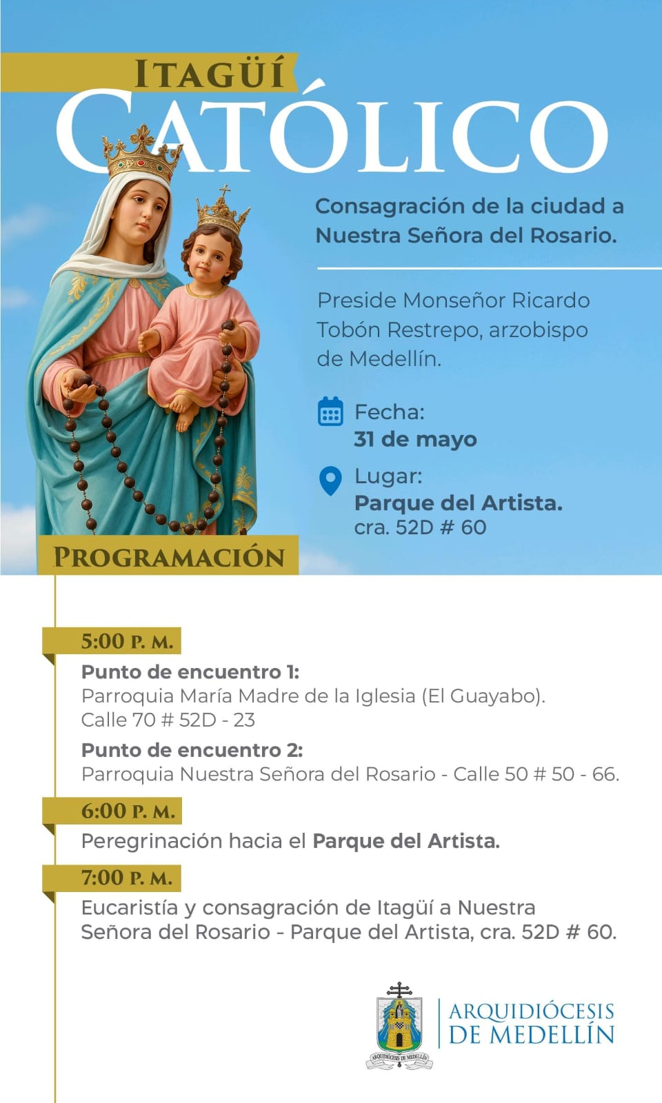 A las 7:00 p. m. presidida por monseñor Ricardo Tobón Restrepo, y acompañado de todos los sacerdotes de las iglesias de este municipio y del alcalde Diego Torres, será la sagrada eucaristía que consagrará a Itagüí a Nuestra Señora del Rosario. La invitación está abierta para todos los antioqueños, en un evento masivo y único para los fieles católicos.