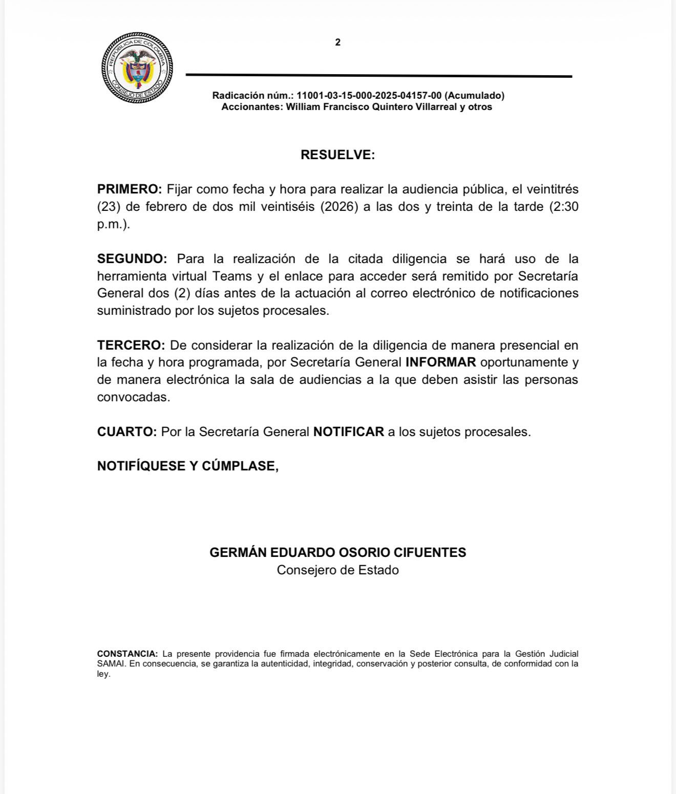 La Sala Especial de Decisión fijó para el 23 de febrero de 2026, a las 2:30 p. m., la audiencia pública de pérdida de investidura contra la senadora Isabel Zuleta, por su presunta participación directa en la organización de este acto.