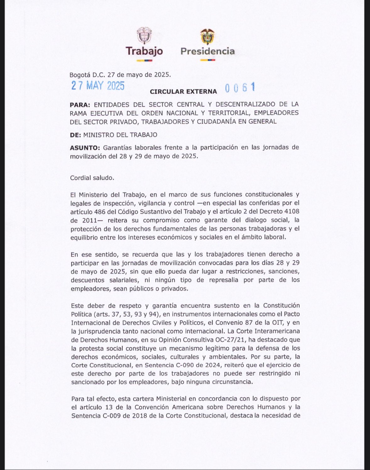 Es de recordar que el ministro de Trabajo Antonio Sanguino aseguró que los trabajadores del país no podrán ser sancionados o blanco de represalias por participar en estos dos días de protestas, además, tampoco se les podrá descontar de su salario estos días.