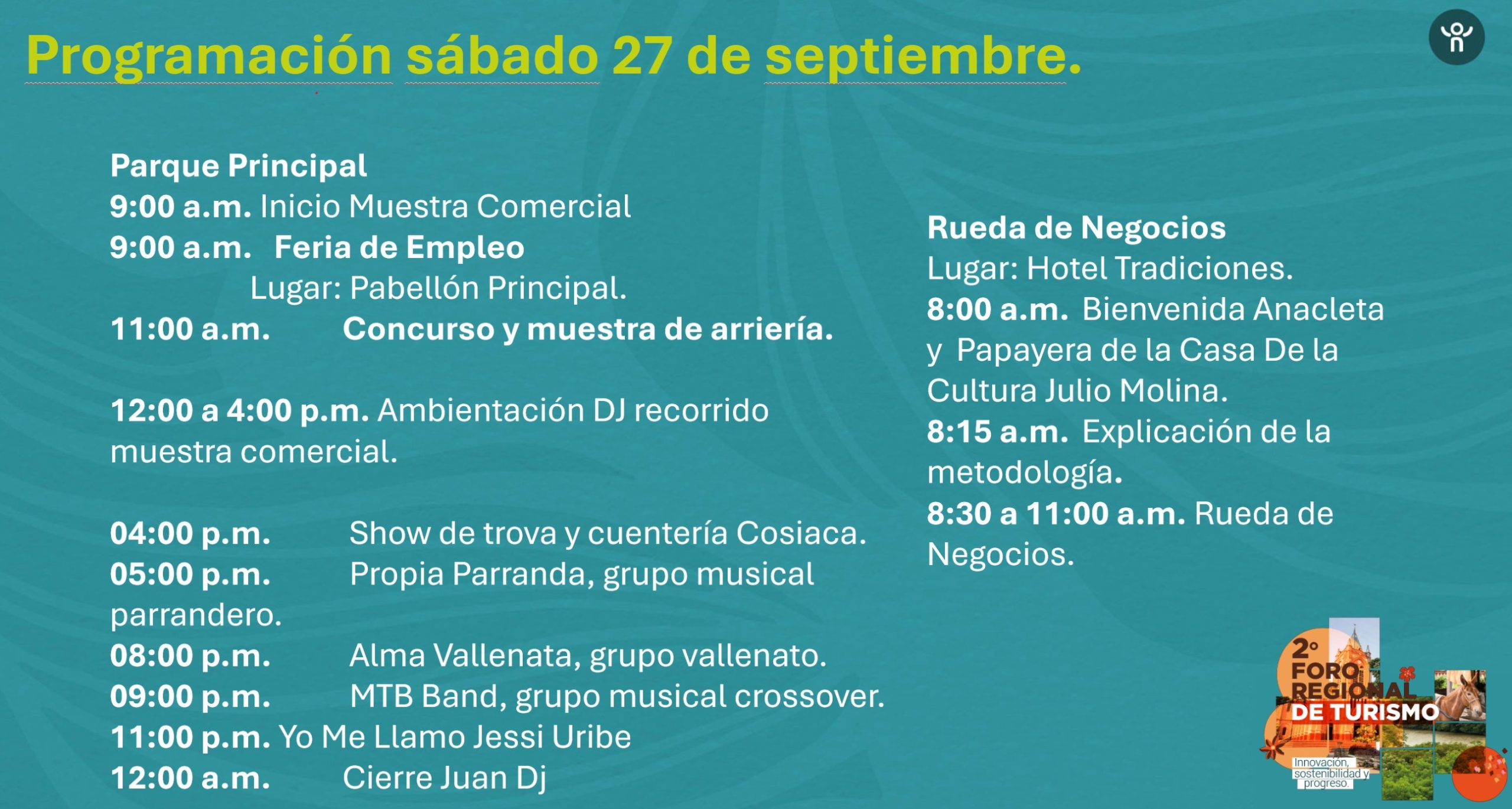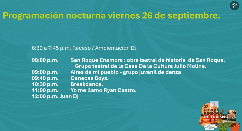 El 2.º Foro Regional de Turismo en Antioquia es un evento con entrada libre para todos los asistentes y se será los días 26 y 27 de septiembre. Los organizadores proyectan una participación superior a las 800 personas. Más de 30 empresas del sector turístico estarán presentes en la Rueda de Negocios, un espacio diseñado para impulsar a las subregiones del Nordeste y el Magdalena Medio como nuevas potencias del turismo sostenible en Colombia.