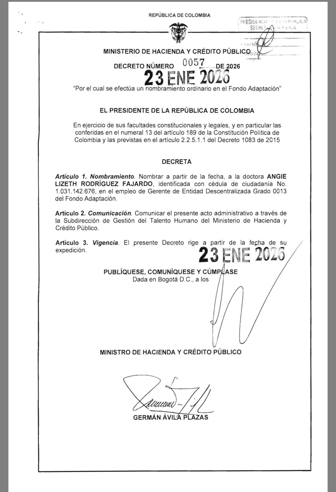 Un decreto presidencial, con fecha del 23 de enero de 2026, nombra en propiedad a la exdirectora del Departamento Administrativo de la Presidencia (DAPRE), Angie Rodríguez, como directora del Fondo de Adaptación, una entidad descentralizada del orden nacional encargada de ejecutar proyectos de gestión del riesgo y adaptación al cambio climático.