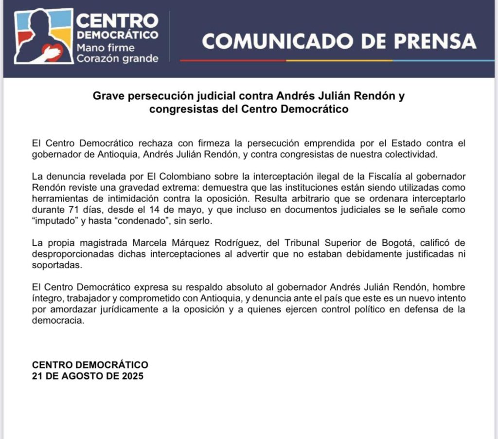 La colectividad agregó que las instituciones “están siendo utilizadas como herramientas de intimidación contra la oposición” y expresó su respaldo absoluto al mandatario antioqueño.