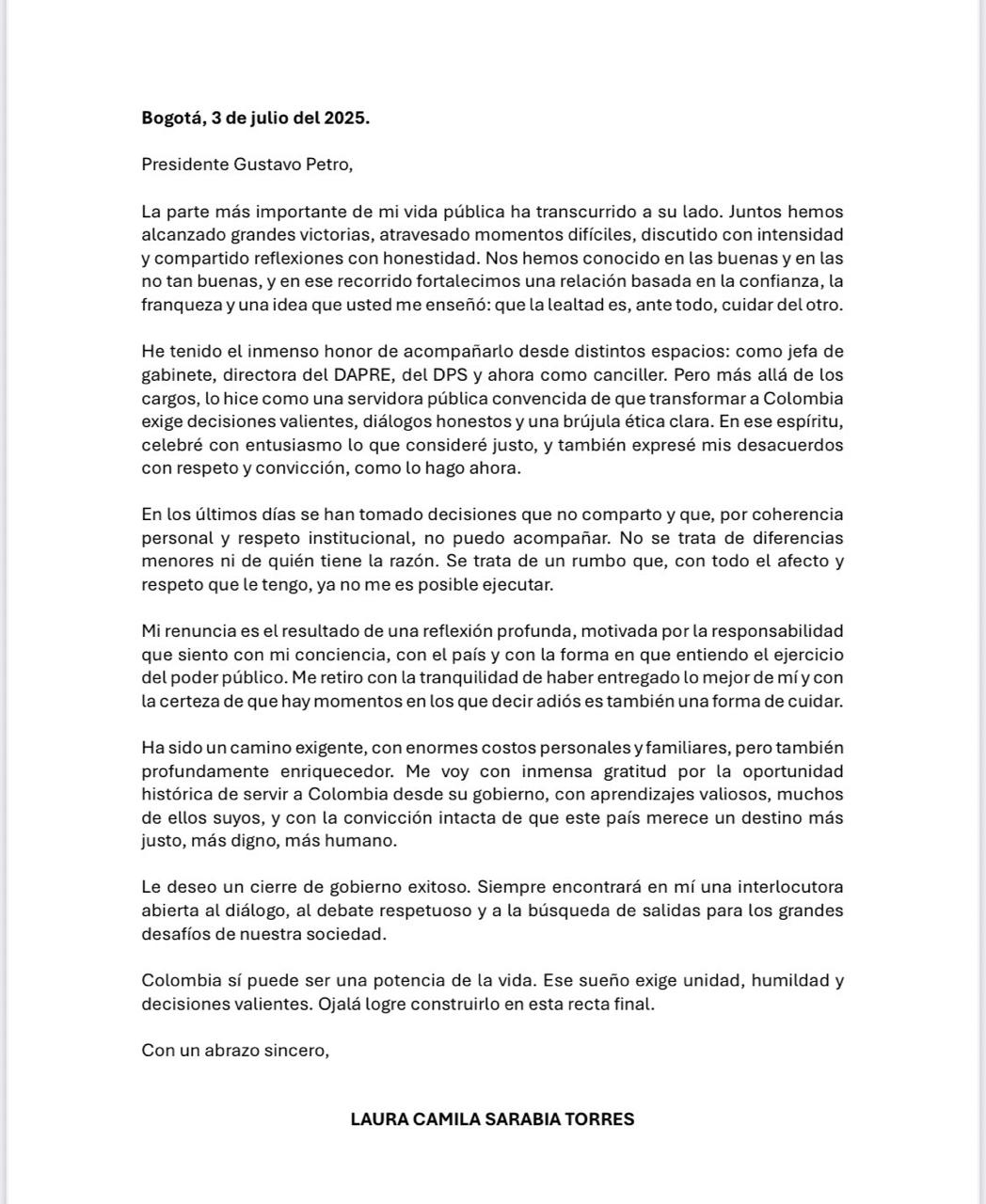 En las últimas horas y a través de su cuenta en X, Laura Sarabia, canciller de Colombia, público su carta de renuncia. Su salida se da luego de toda la polémica que se generó por cuenta del contrato con la Imprenta Nacional de Portugal para la expedición de pasaportes en Colombia. Sarabia deja su cargo y manifesta desacuerdos con recientes decisiones del presidente Gustavo Petro.